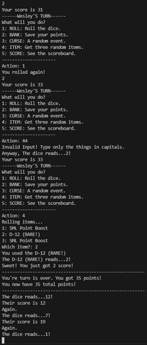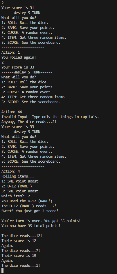 Cursed Dice is a text-based Python game I made for a class project. You simply roll the dice to gather points, and you bank your points when you're ready. You can roll infinitely, but if you roll a one, your score resets to 0 and you lose your turn.